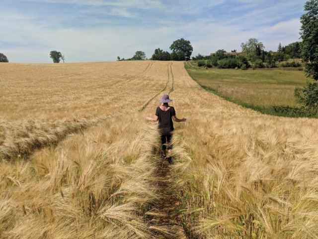 I read books – not articles, not headlines, not posts, not snippets of paragraphs, but actual books. Like summer vacation when I was a kid, I lay down in a shady spot with the intention of reading for just a few minutes, only to emerge from a literary fugue state two hours later. And when one book was done, I put it down and started another. I wrote. I sat with my feet in the creek, and let a sapphire-blue dragonfly land on my outstretched hand. I watched the wind ripple through fields of grain and riffle the tops of trees. I gardened, canned apricots, ate cherries off the tree, watched the sun set, strolled through the orchard, helped a friend build a staircase. Over bread, cheese, and cheap wine with ice cubes, we conversed at length about the health of trees, how to keep flies out of the composting toilet, why creativity seems so hard in the midst of urban professional life. We talked about art, and our childhoods, and dogs. We talked to the dogs, when they came over for belly rubs, tired out from chasing bees and chickens. Turns out, Williams was right: so much does depend “upon a red wheelbarrow, glazed with rain water, beside the white chickens.”